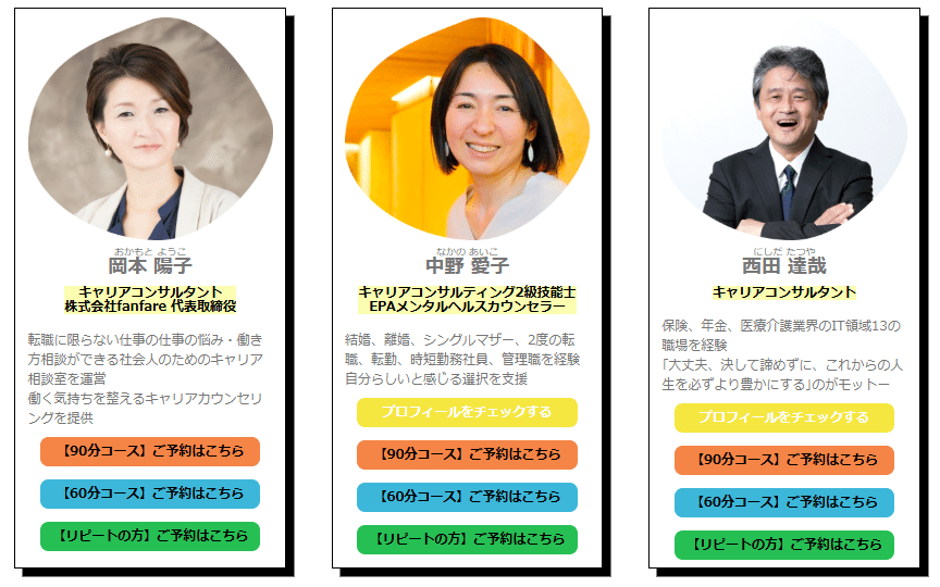 現在、下記のキャリアコンサルタントが対応しています。ぜひ1年の振り返りをしたい方、これからのキャリアを真剣に考えたい方はキャリアカウンセリングを受けてみませんか?