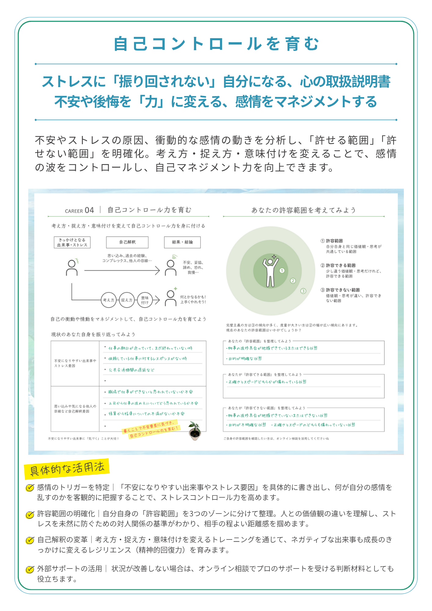 詳しく見る あなたのストレス要因に気づき、感情をコントロールするために必要なことを整理する。