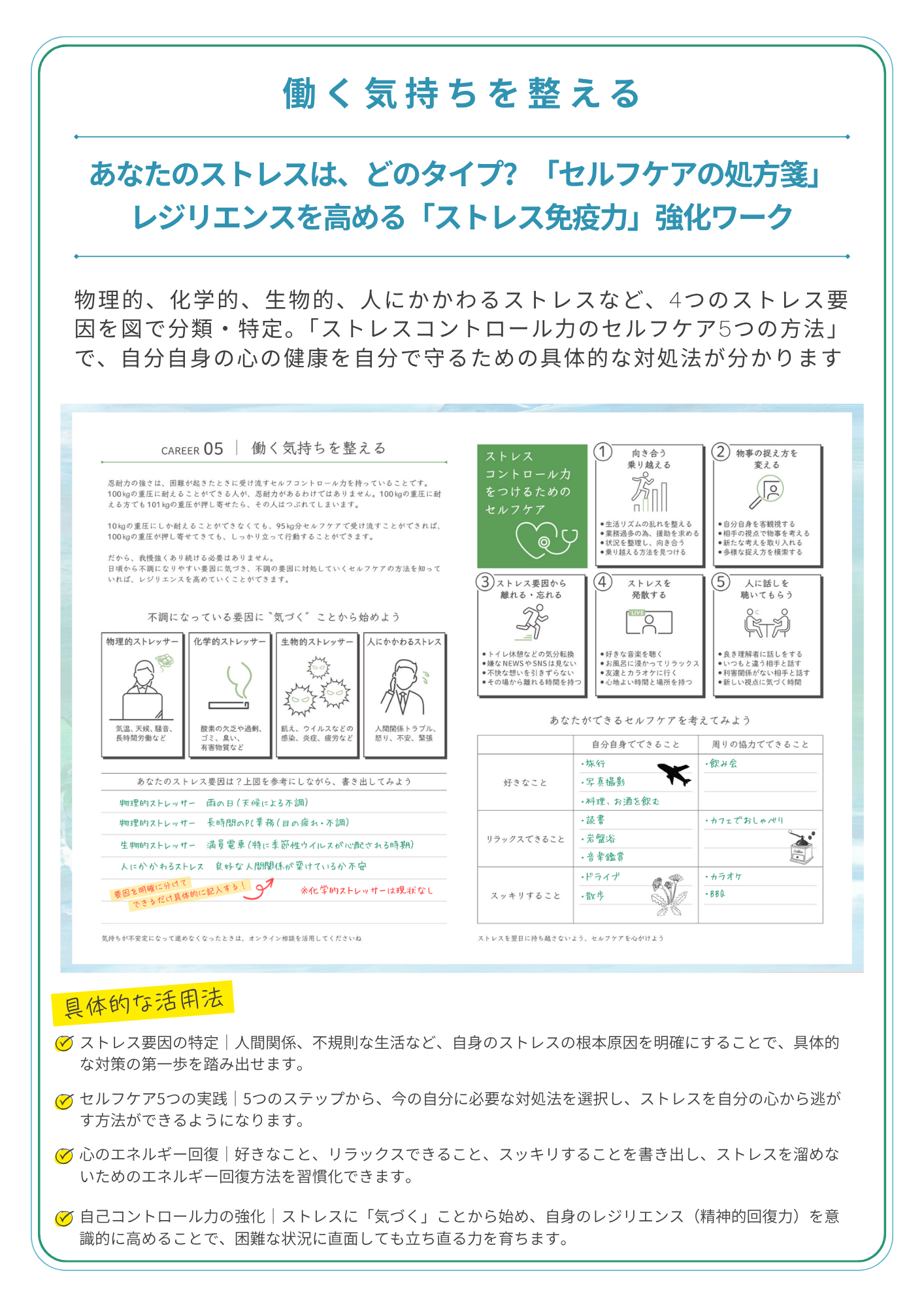 詳しく見る ストレスが起きたときに気持ちを回復するご自身なりのセルフケア法を考える。