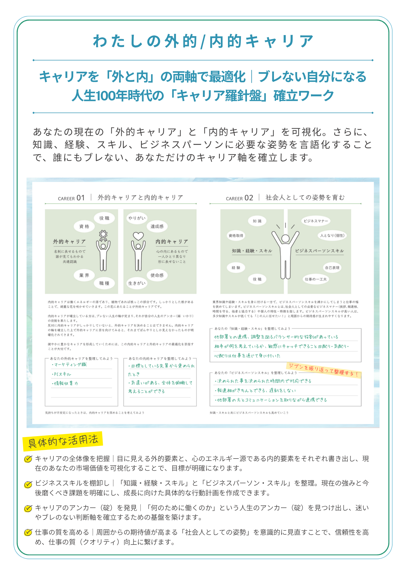 詳しく見る あなたの働く原動力がわかる内的キャリアの整理と、社会人として必要なビジネスパーソンスキルを確認する。