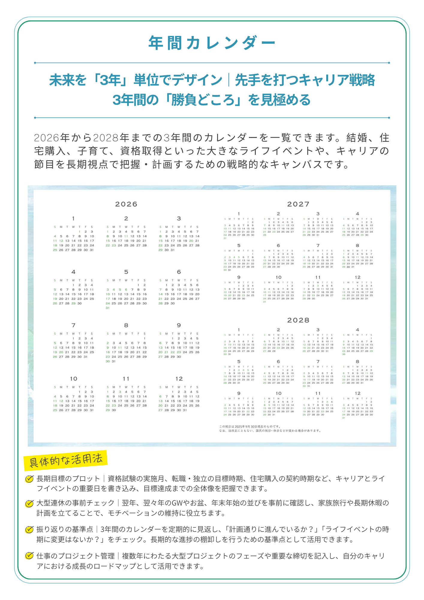 2027年3月までの月間カレンダー付きのため、4月始まり手帳を活用している方、新年度から新たな環境でスタートされる方にもご活用頂けます。